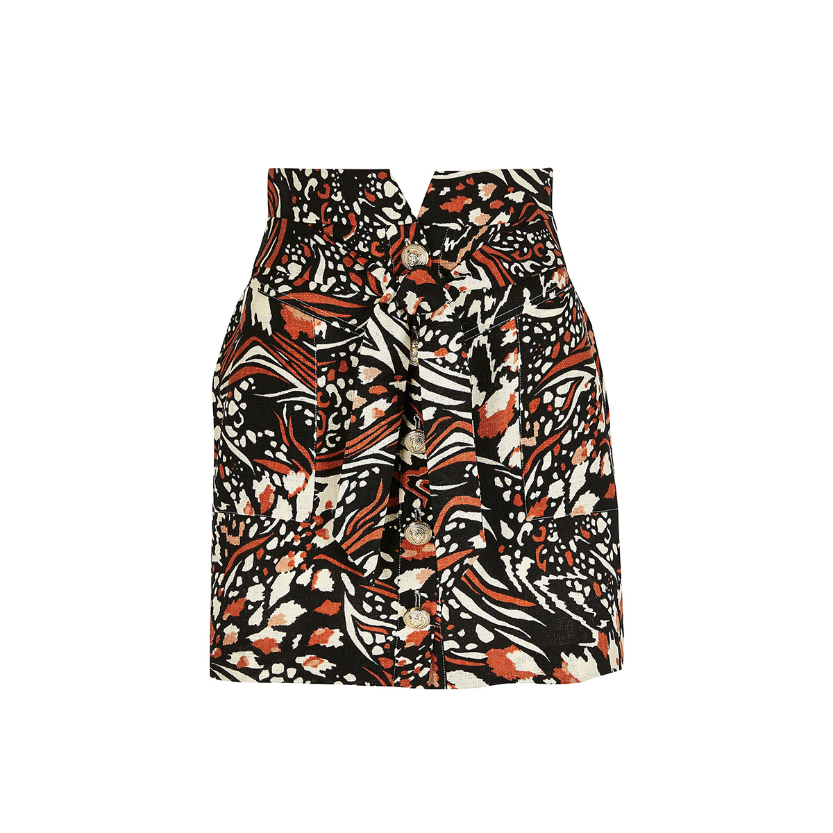 It's a fancy safari when this ruffled + tropical swim top joins a belted + pocketed skirt and chain link statement earrings.